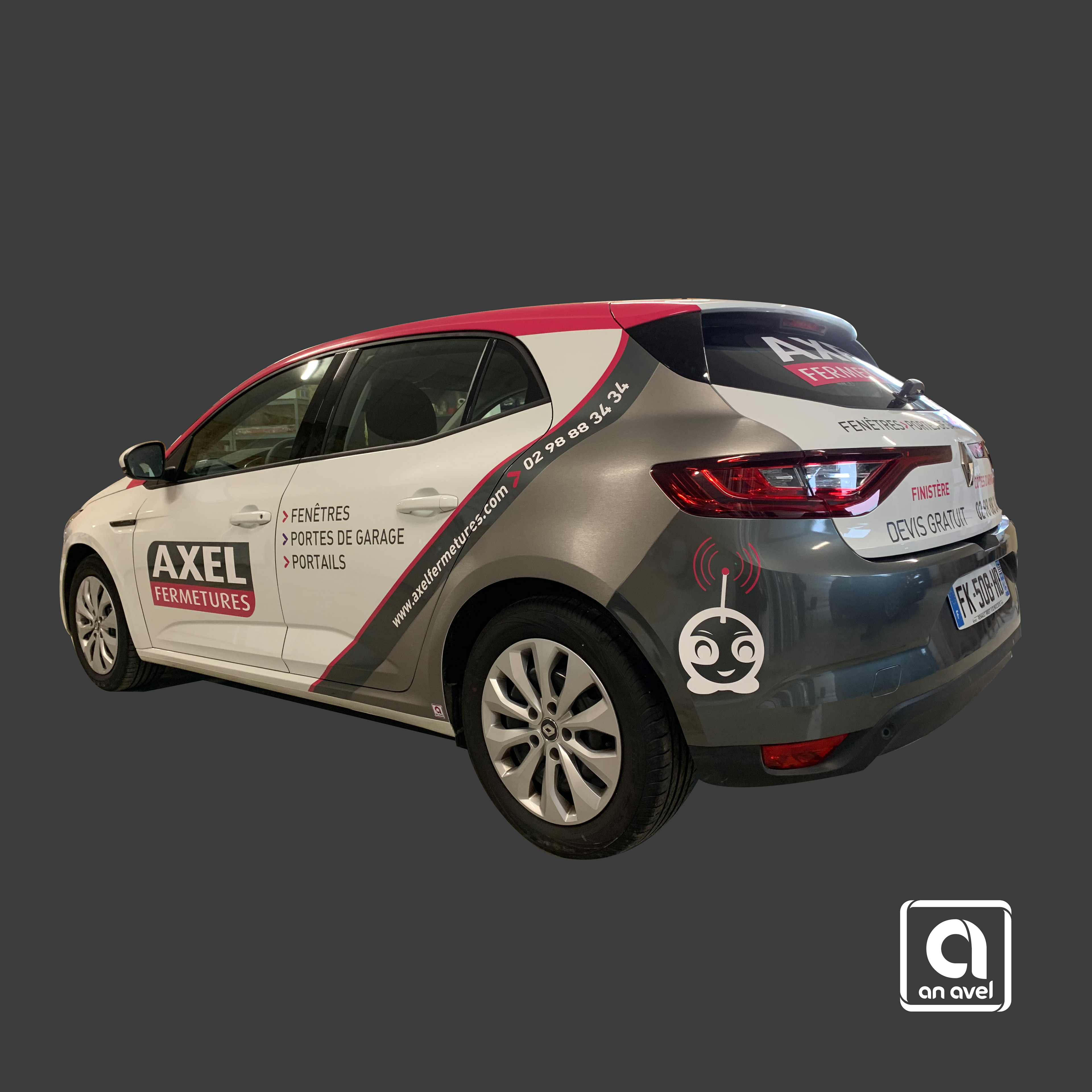 Pour Axel Fermetures, Réalisation entre autres d'enseignes, de marquage de véhicule et de panneaux de chantier.
