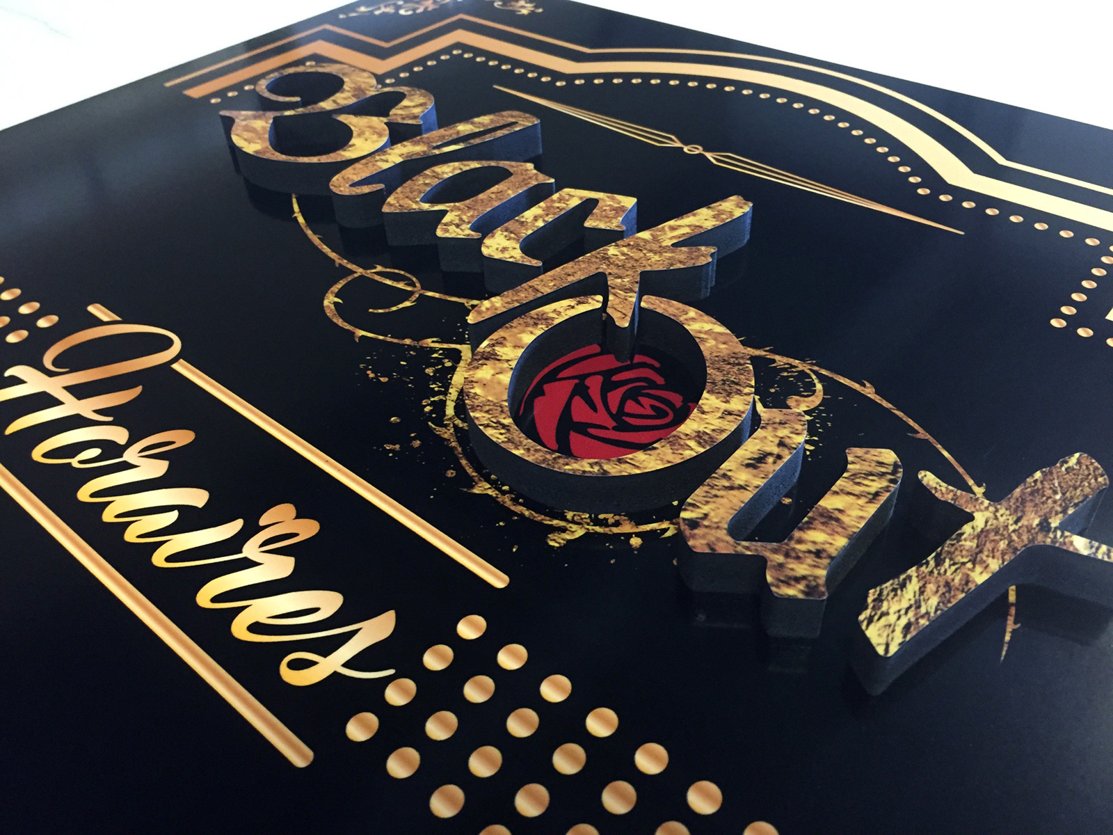 Lettres boitier diffusantes + enseigne drapeau + bague + décor imprimé