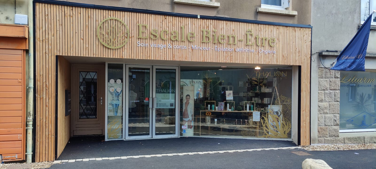 Lettres découpées sur entretoises + enseigne drapeau + vitrophanie
